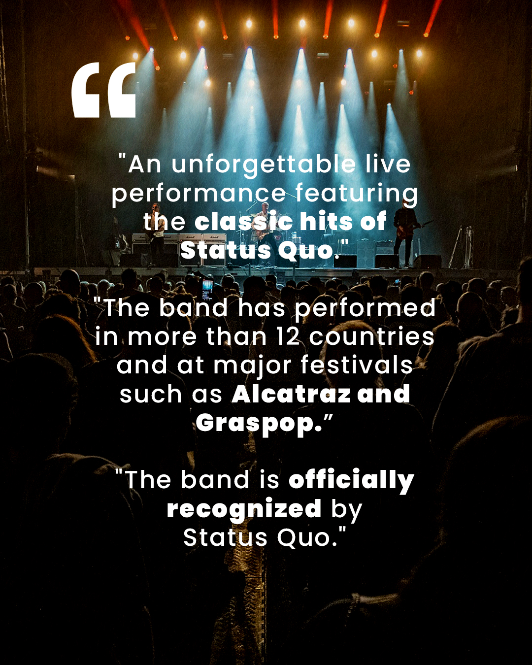 De Belgische reïncarnatie van Status Quo. Officieel erkend als tribute band door Status Quo zelf, stonden ze reeds op het podium van Alcatraz en Graspop en toerden ze door 12 landen.